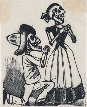 This metal engraving is a vignette for the Feast of the Death, created by Mexican artist José Guadalupe Posada between 1890 and 1910. Image is in the public domain. See larger version of vignette at The Met.